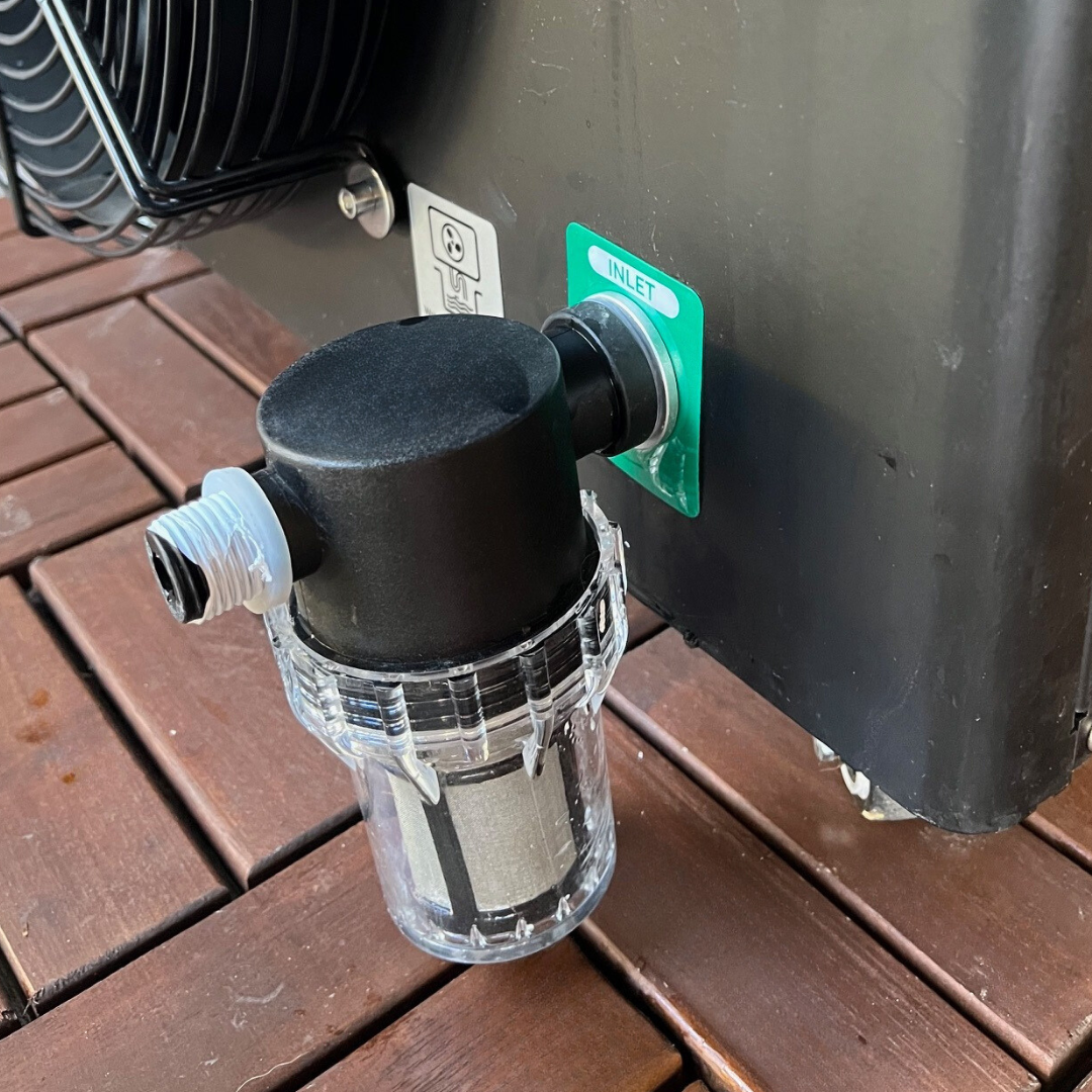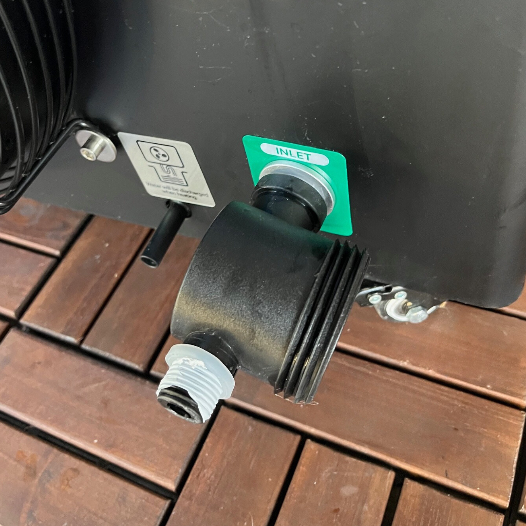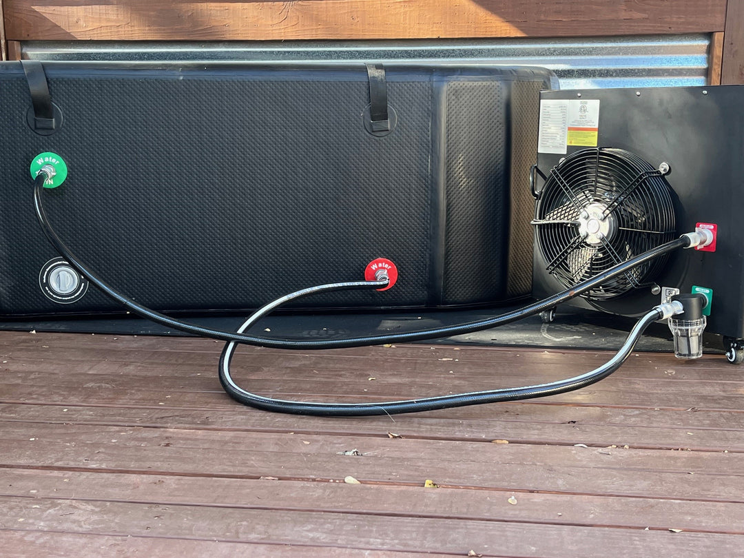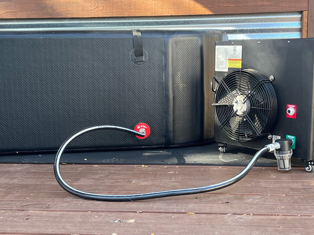 - Connect from the chiller’s WATER INLET (at the strainer) to the tub’s lower port.