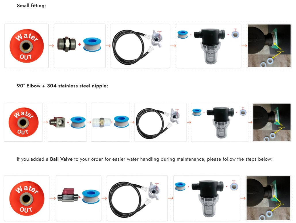 - Wrap PTFE (Teflon) tape around all male threads: 2–3 layers in a clockwise direction. This helps prevent leaks and protects the threads. Avoid over-wrapping; fittings should screw in smoothly by hand before final tightening.