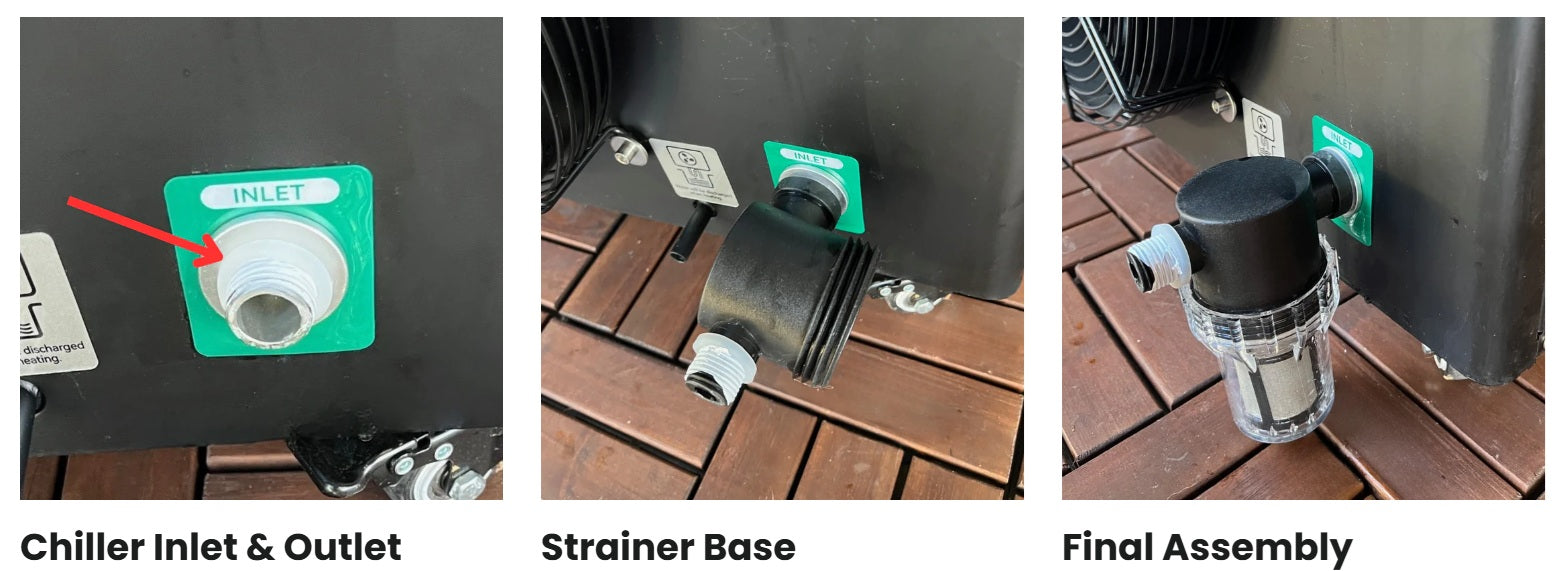 - Connect from the chiller’s WATER INLET (at the strainer) to the tub’s lower port (Green to Red).